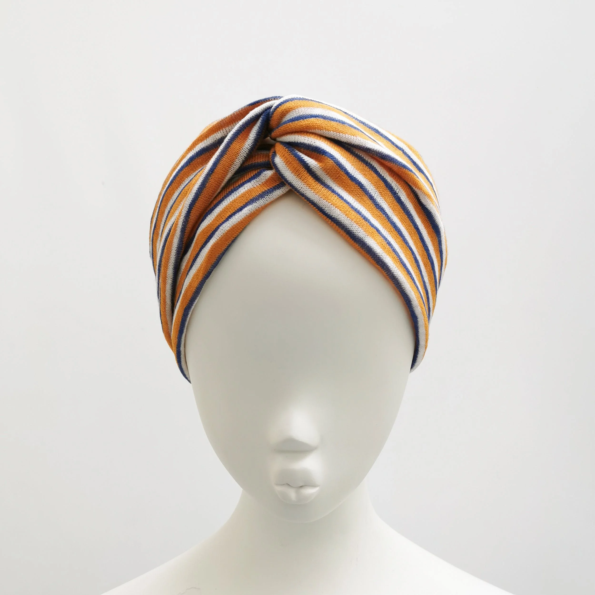 Modern bohemian style wide mustard, blue and white striped wool blend turban twist headband
